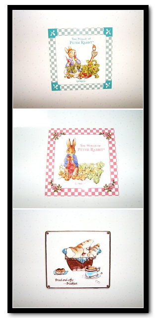 另外在廚房牆面正中間有塊磁磚是有圖的(第三個),但只有一個有點單調,所以我去小妹工作的店裡,買了二張可轉印在磁磚上的彼得兔立體貼紙貼上,這貼紙不便宜,但質感不錯,貼上去後不要去刮它不會掉,還可以用水擦拭~很方便~貼完後老媽也沒發現原來它是貼紙,還以為是磁磚本來就有的花樣呢