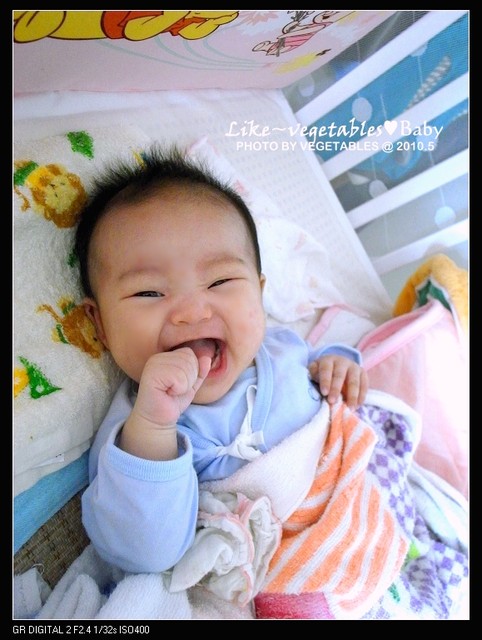有時候抱到快睡著時放下床,安安就會自動向左翻,邊翻還邊啃手~