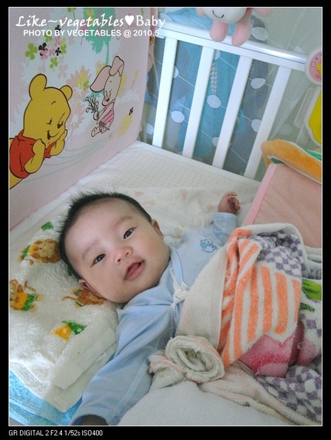 翻身 放在自己的小床上會一直想往左邊翻,翻到90度就會卡住,一直卡住也會生氣,因為看不到音樂鈴