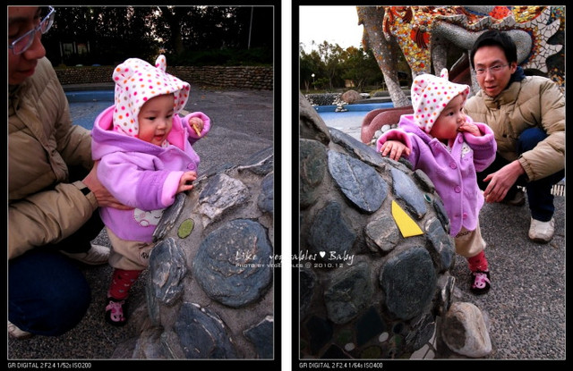 帶著她摸著不同的東西,摸到粗粗的石頭覺得很新奇![]()
