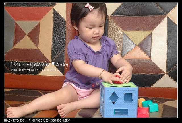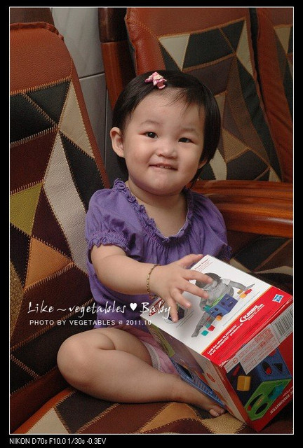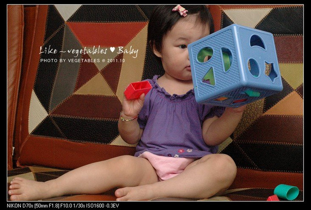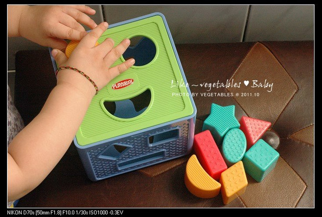 學會後,她就一直不斷的重覆丟進去→打開→拿出來,也會拿出來疊疊樂,更多的時候是拿來裝她自己亂七八糟的寶物![]()