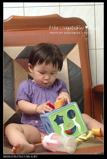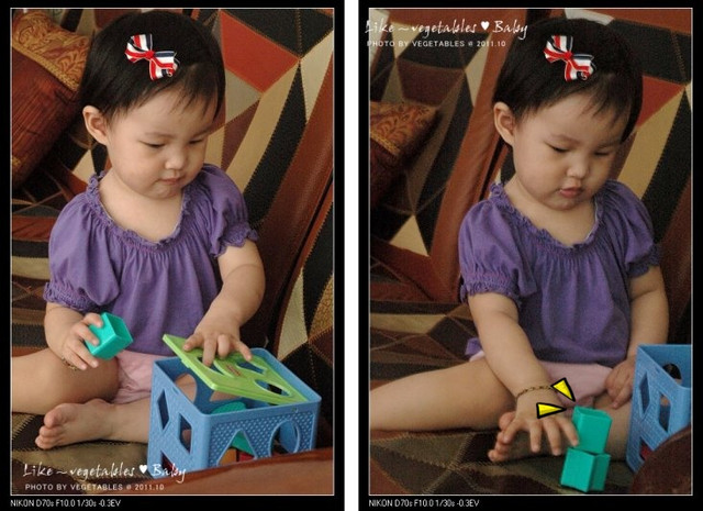 抱著益智盒太久後,菜安安就漸漸沒耐心,變成暴力小安,拿起來就硬要塞進盒子裡啦!