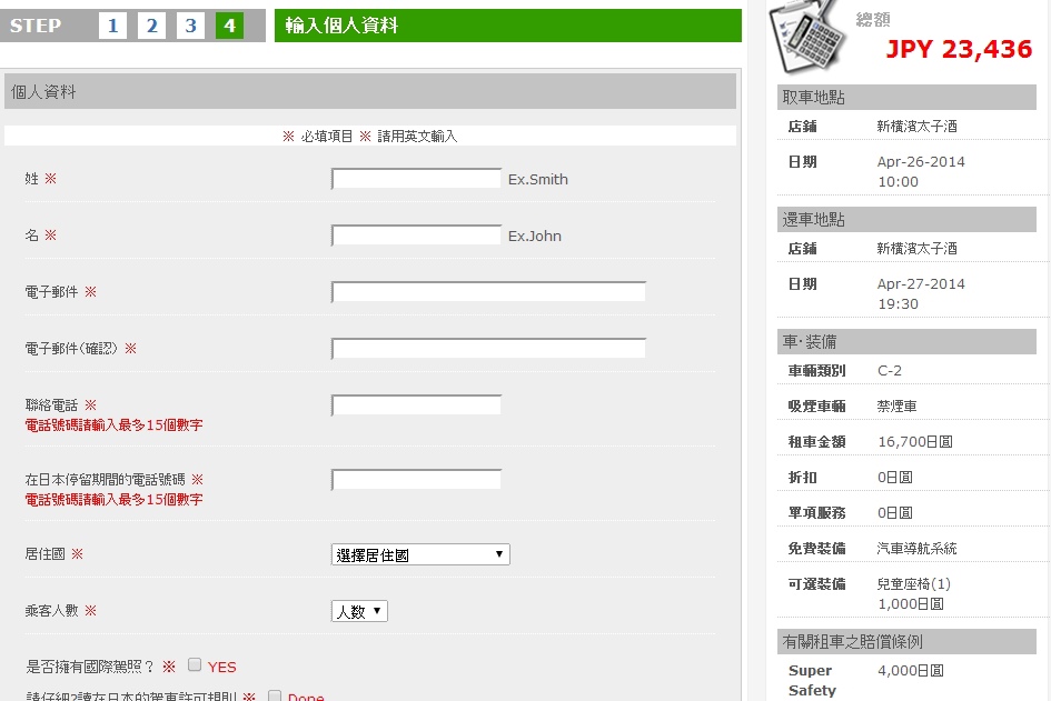 *記得姓名要輸入與護照上的相同,辦取車時會核對